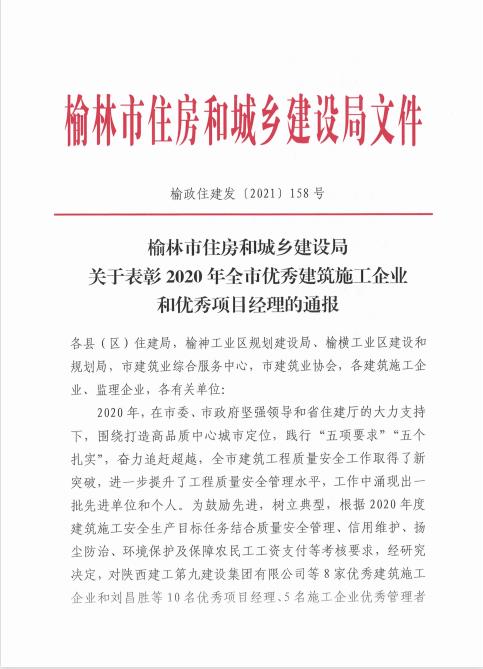 榆林市住房和城鄉(xiāng)建設(shè)局關(guān)于表彰2020年全市優(yōu)秀建筑施工企業(yè)和優(yōu)秀項目經(jīng)理的通報