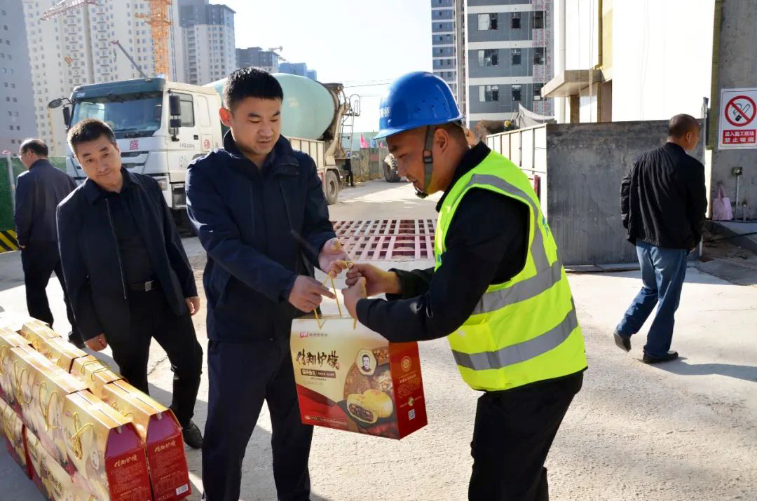公司總經(jīng)理徐遼飛、副總經(jīng)理劉世斌、總工程師曹光軍、總經(jīng)理助理楊斌一行赴榆林區(qū)內(nèi)盛景和苑項目、盛景蘭亭項目和流水馨城項目現(xiàn)場,慰問堅守在項目一線的員工,并為他們送上羊肉、月餅、水果等慰問品。每到一個項目,公司領(lǐng)導都送上一聲聲“節(jié)日快樂”的祝福,道上一句句“大家辛苦了”的關(guān)懷與感激。